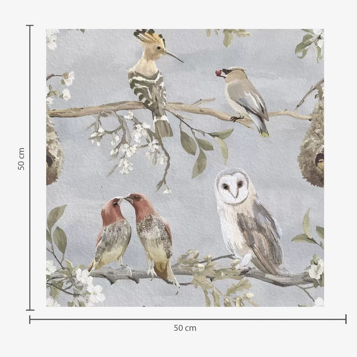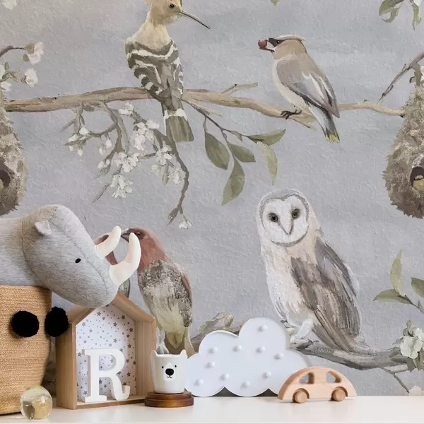 Tapete Vögel auf Ästen mit Blumen vor grauem Hintergrund Nr. a00738