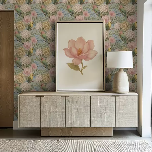 Tapete Papageien zwischen Pfingstrosen, Hortensien und Magnolien Nr. a00747