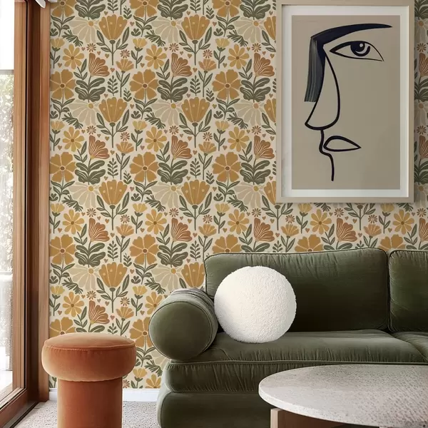 Tapete Stilisierte Blumen in warmen Farbtönen mit Herzen Nr. a00752