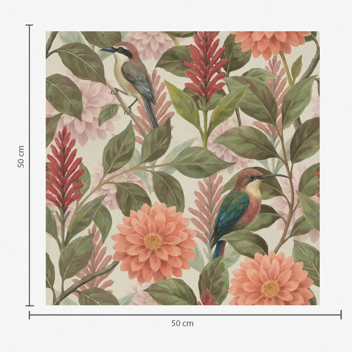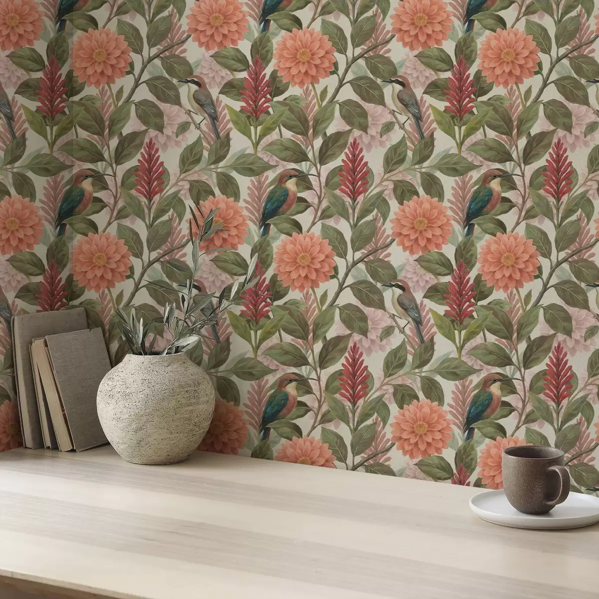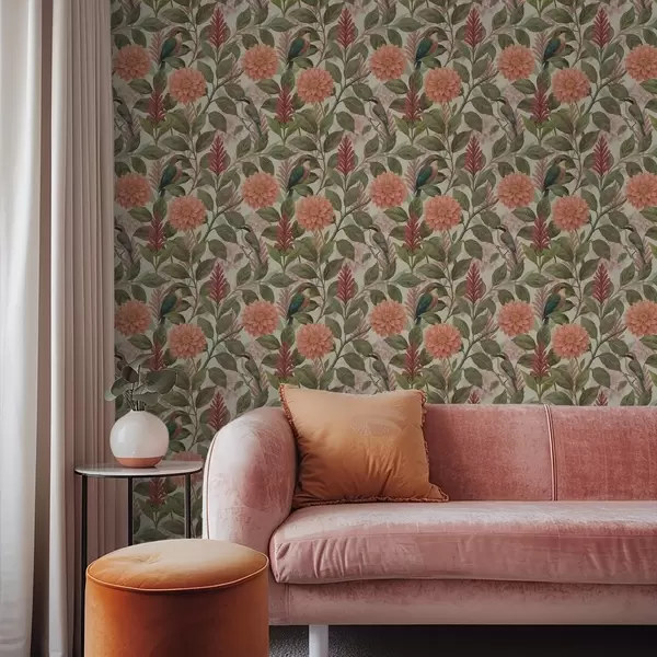 Tapete Vögel zwischen Blumen und Blättern in warmen Farbtönen Nr. a00753