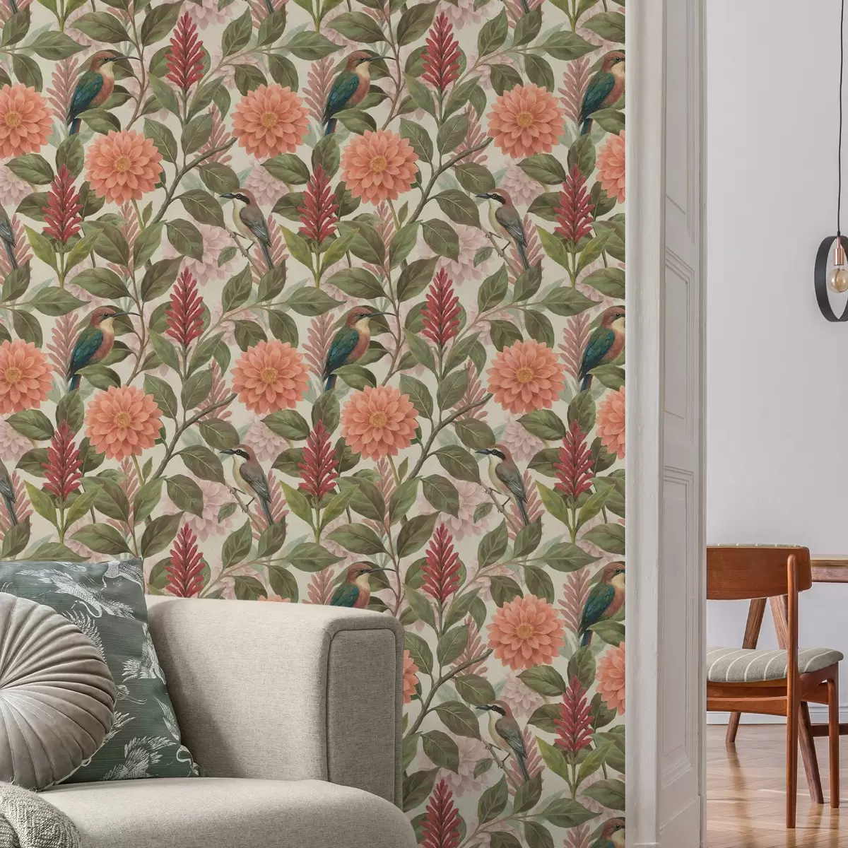 Tapete Vögel zwischen Blumen und Blättern in warmen Farbtönen Nr. a00753