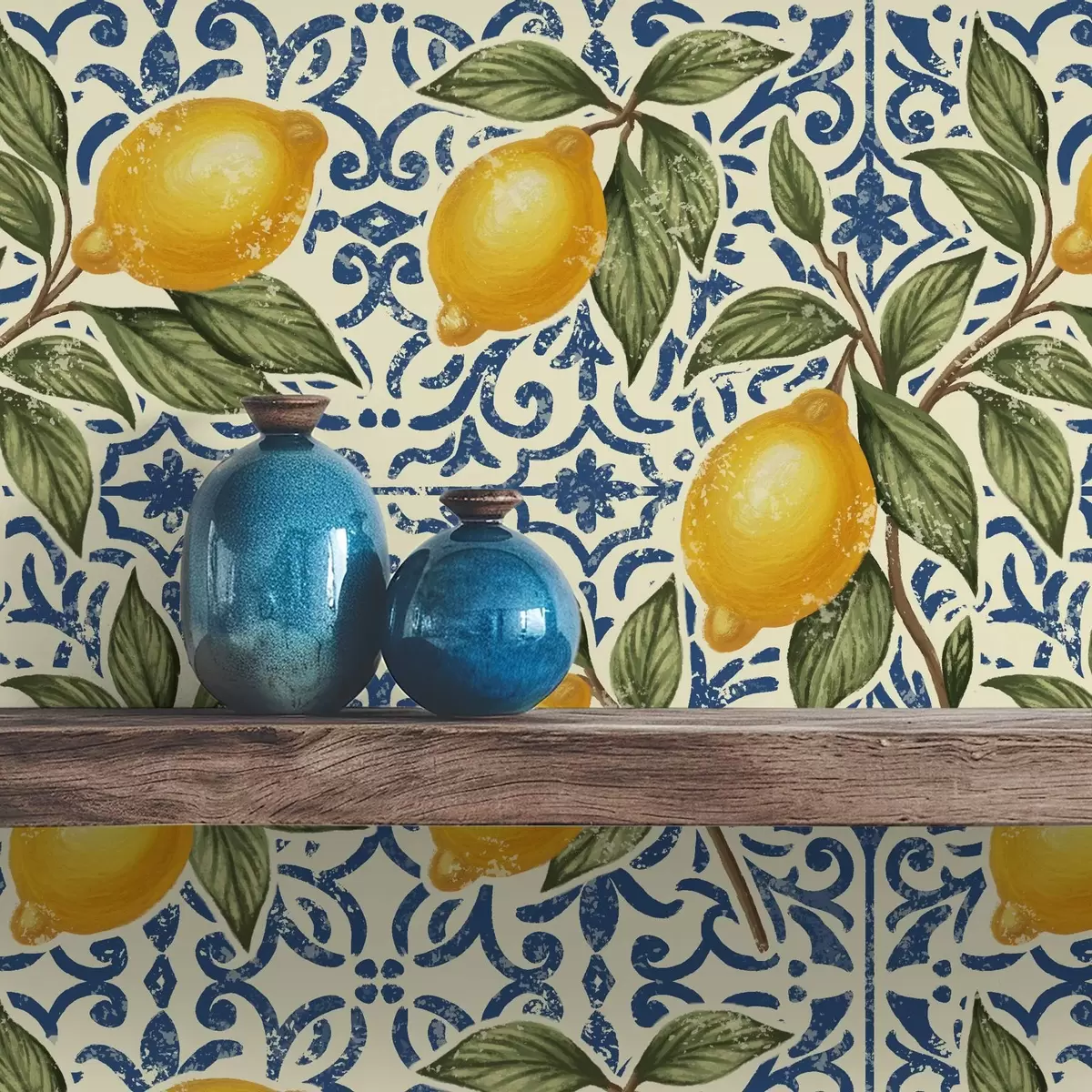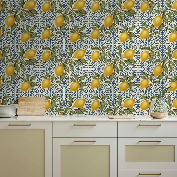 Tapete Zitronenzweige mit blauem dekorativem Hintergrund Nr. a00763