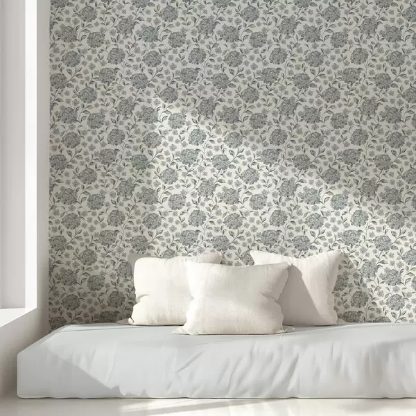 Tapete Buschige Blüten und Blätter in einer grau-blauen Farbpalette Nr. a00778