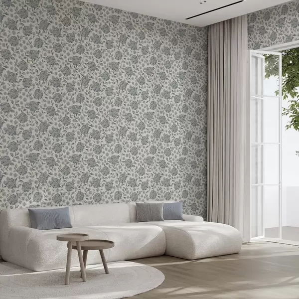Tapete Buschige Blüten und Blätter in einer grau-blauen Farbpalette Nr. a00778