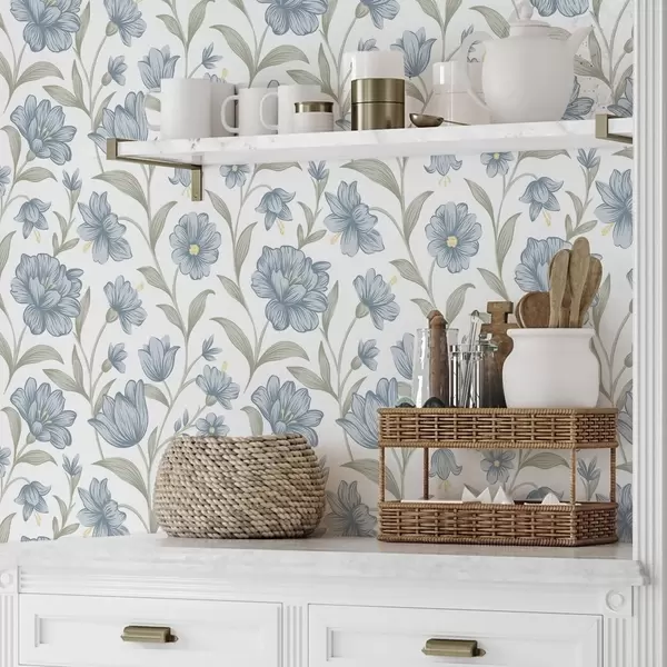 Tapete Staubblaue Blumen mit Olivenblättern auf weißem Hintergrund Nr. a00780