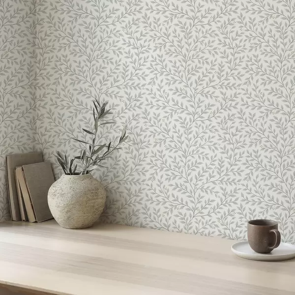 Tapete Zweige mit Blättern und Beeren, hellcremefarben und salbeifarben Nr. a00783