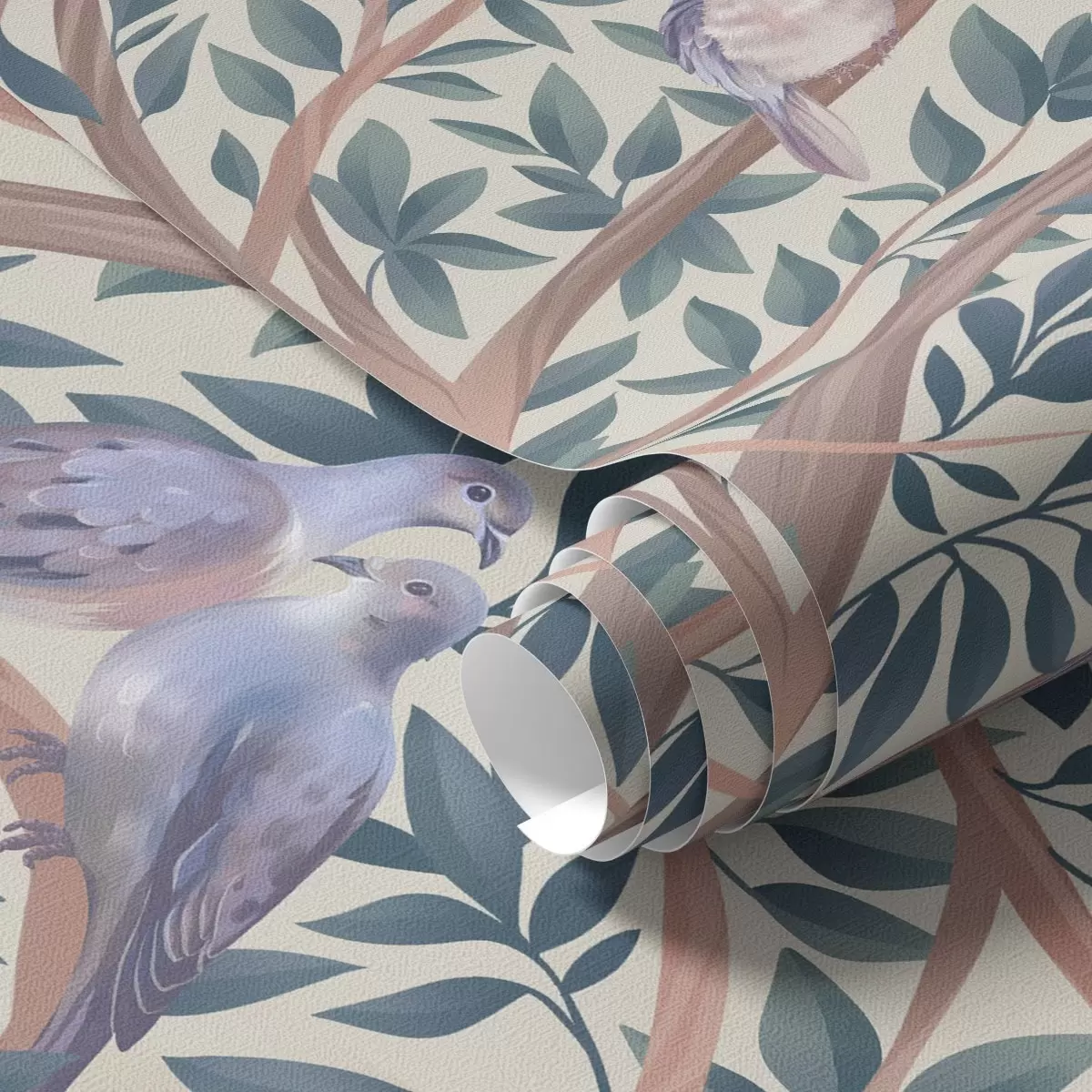 Tapete Tauben zwischen Zweigen und Blättern in sanften Pastelltönen Nr. a00796