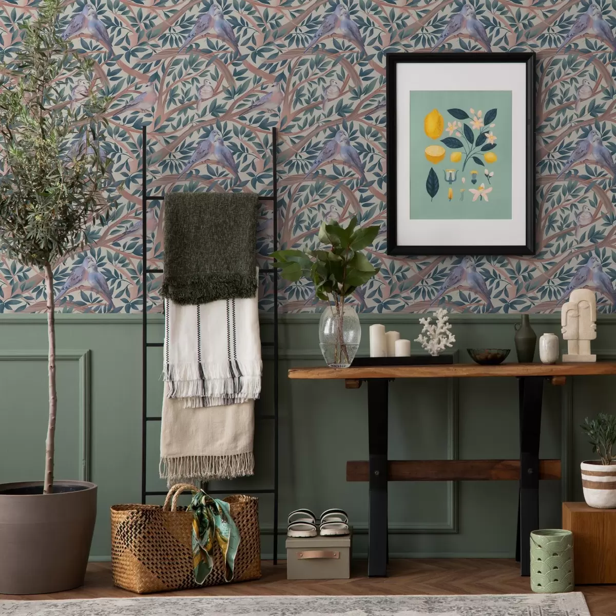 Tapete Tauben zwischen Zweigen und Blättern in sanften Pastelltönen Nr. a00796