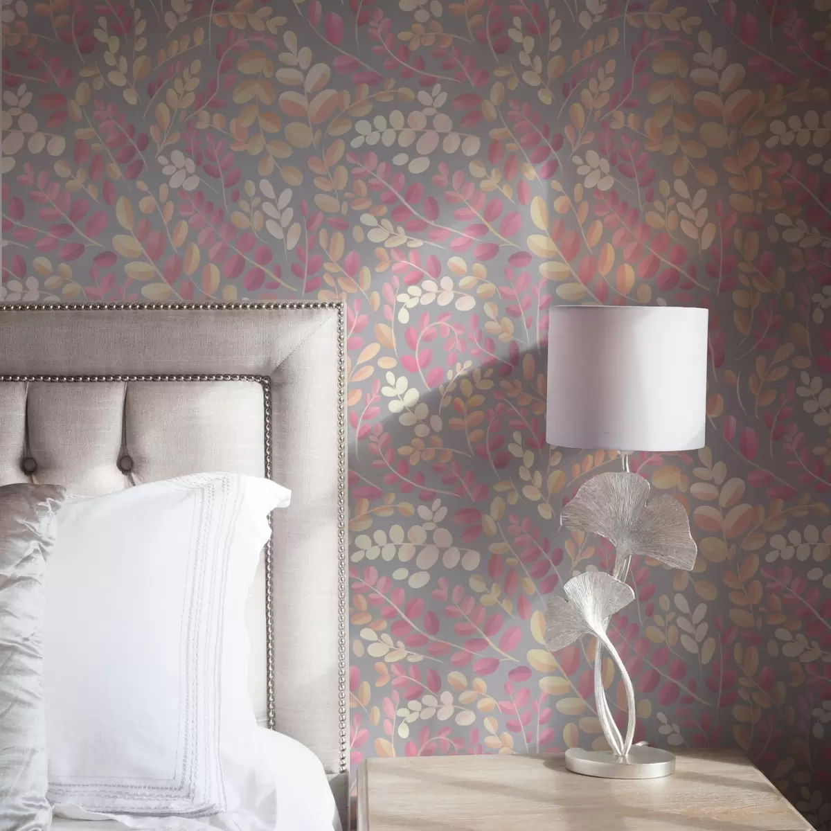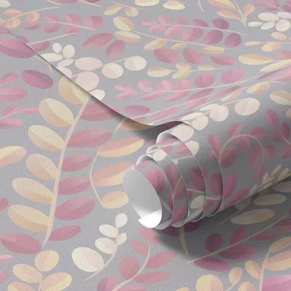 Tapete Pastellfarbene Zweige mit rosa-pfirsichfarbenem Laub auf grauem Hintergrund Nr. a00799v1