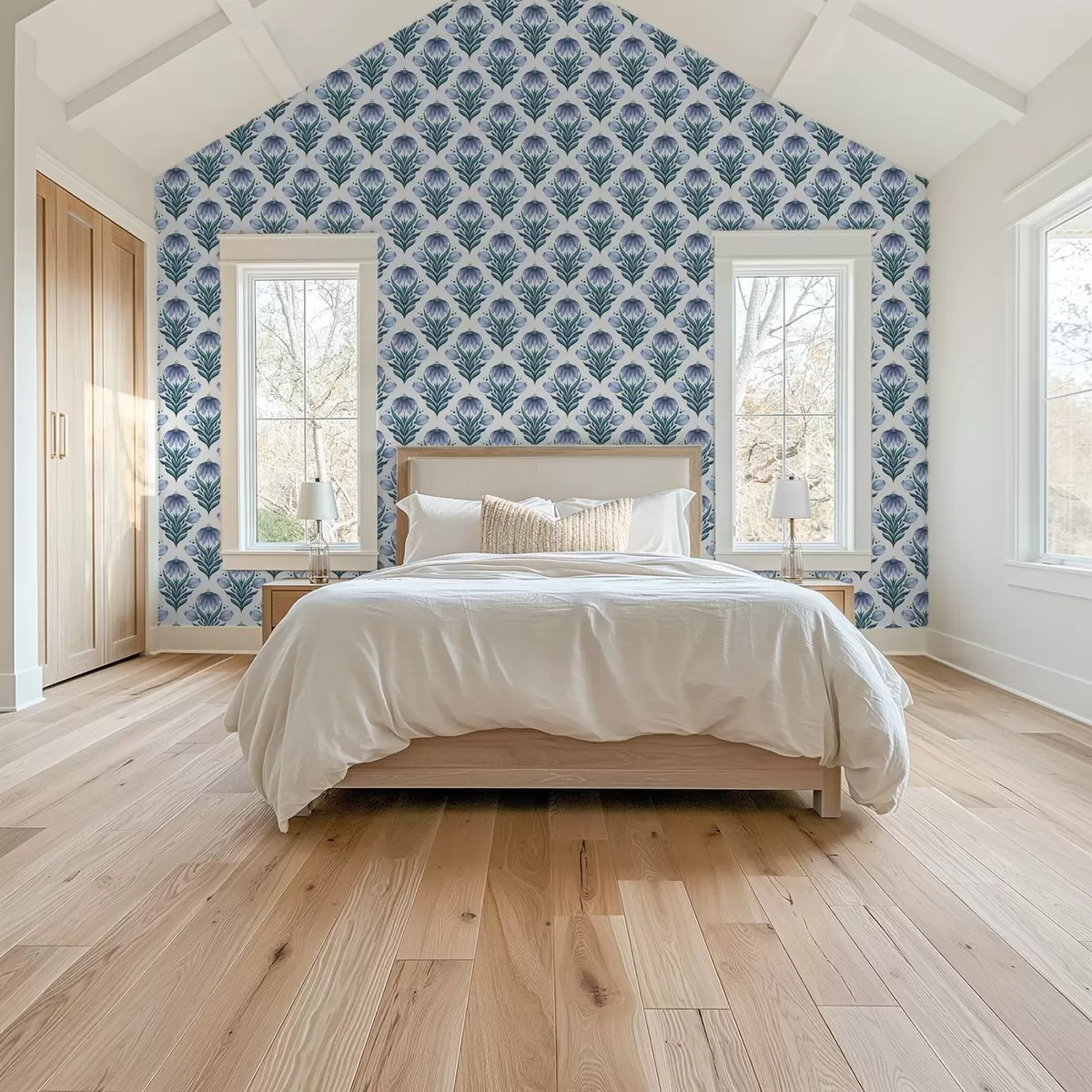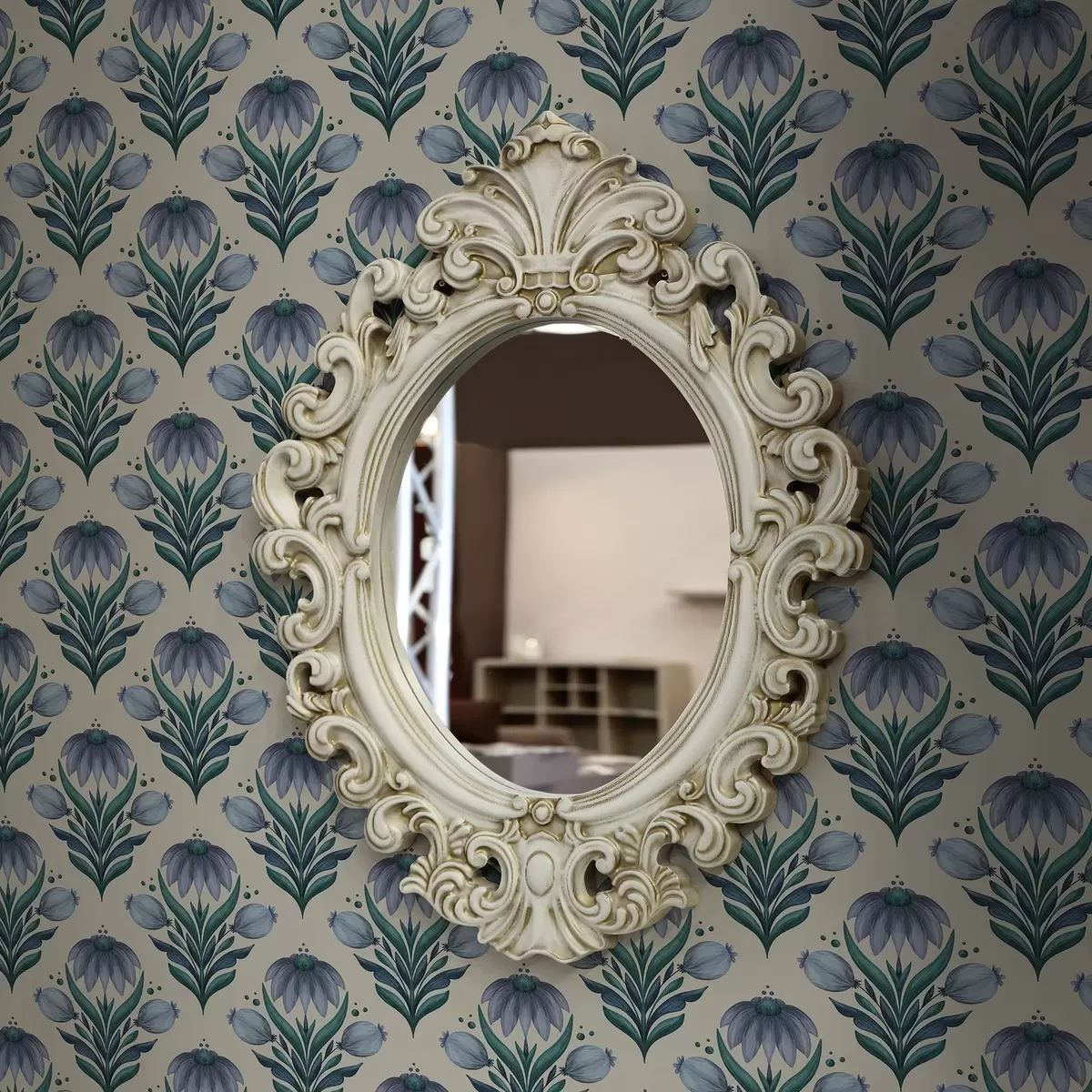 Tapete Symmetrisches Blumenornament in Blau-Weiß-Tönen Nr. a00812v2