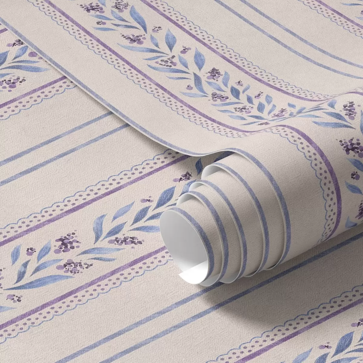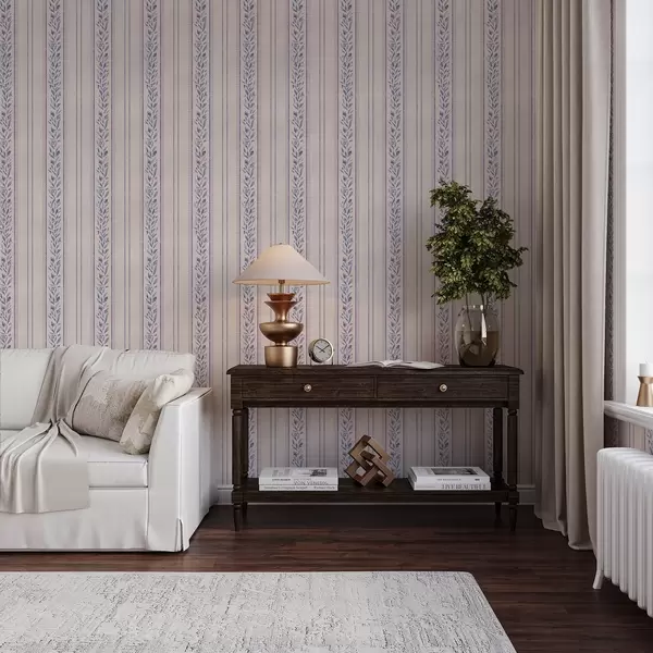 Tapete Vertikale Streifen mit lavendelfarbenen Vignetten, warmes Beige Nr. a00813