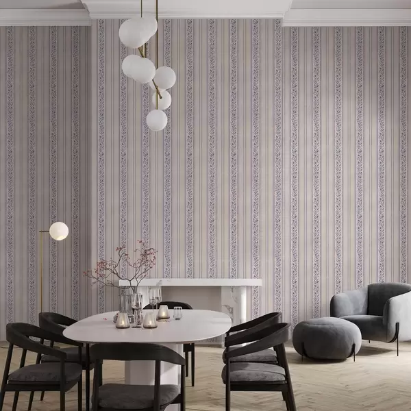 Tapete Vertikale Streifen mit lavendelfarbenen Vignetten, warmes Beige Nr. a00813