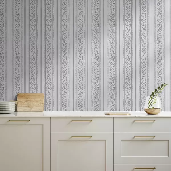 Tapete Streifen mit Spitze und Zweigen auf kühlem Weiß Nr. a00814v1