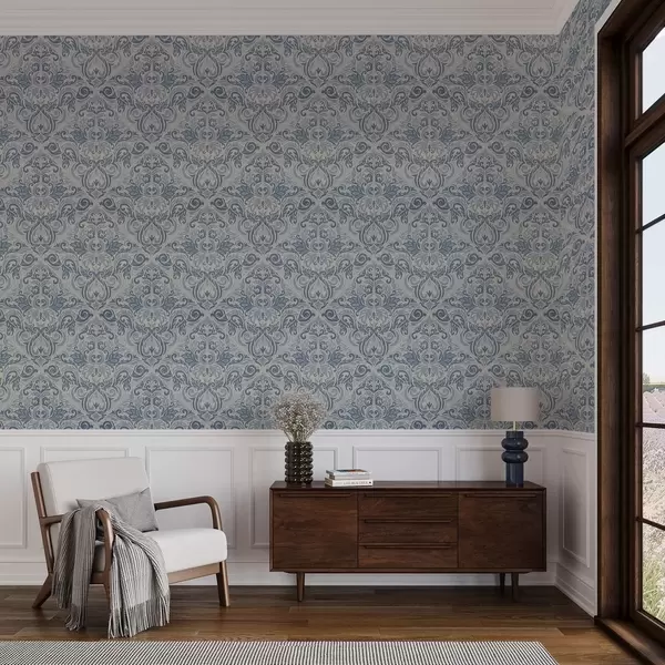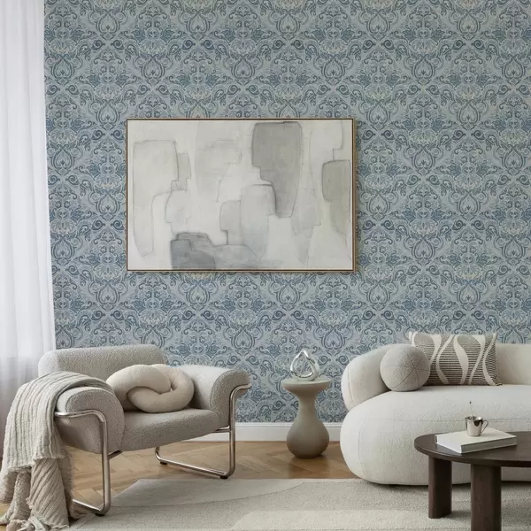 Tapete Klassischer Damast, blaue Motive auf cremefarbenem Grund Nr. a00826v1