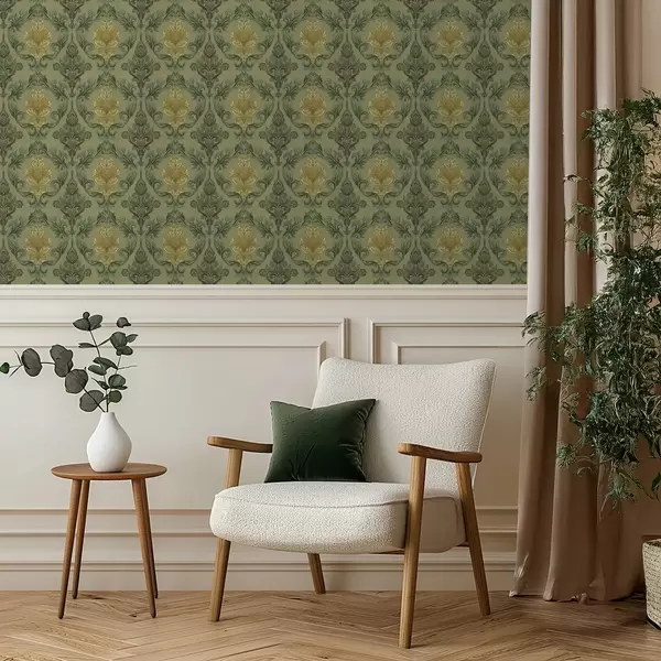 Tapete Damast mit pflanzlichen Schnörkeln, oliv-ockerfarbene Palette Nr. a00828