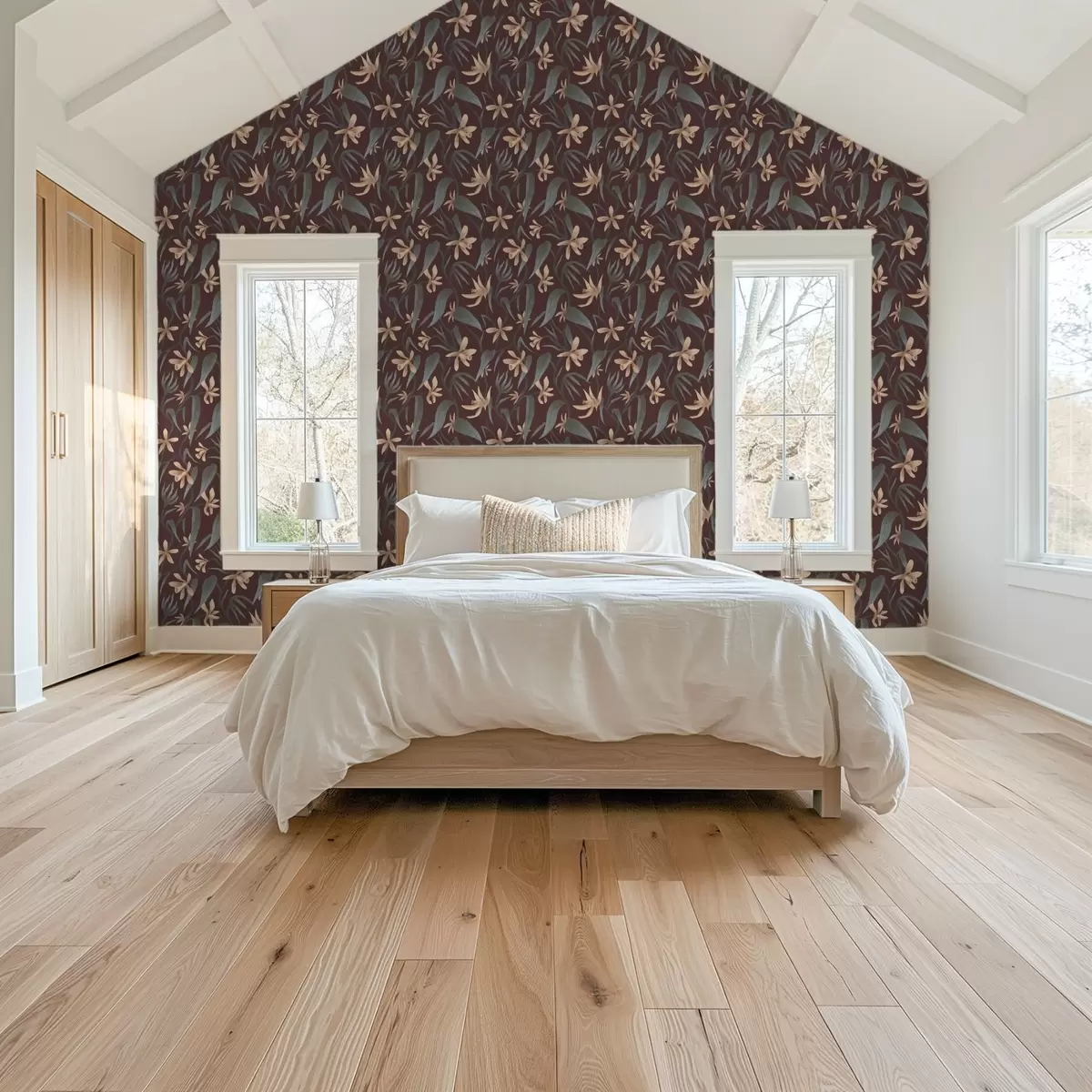 Tapete Cremefarbene Blumen mit grauen Blättern auf burgunderrotem Hintergrund Nr. a00833