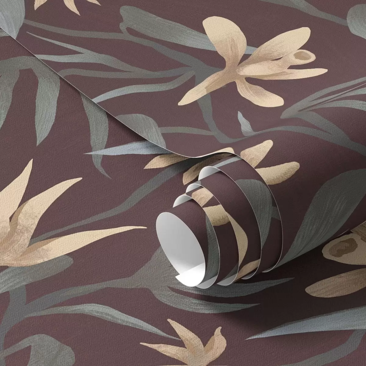 Tapete Cremefarbene Blumen mit grauen Blättern auf burgunderrotem Hintergrund Nr. a00833