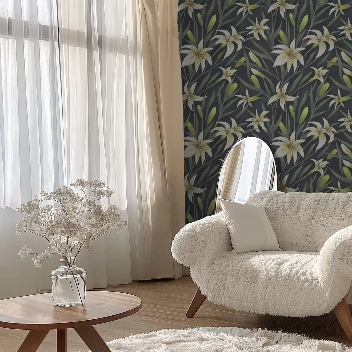Tapete Cremefarbene Lilien mit Blättern auf dunklem Hintergrund Nr. a00837v1