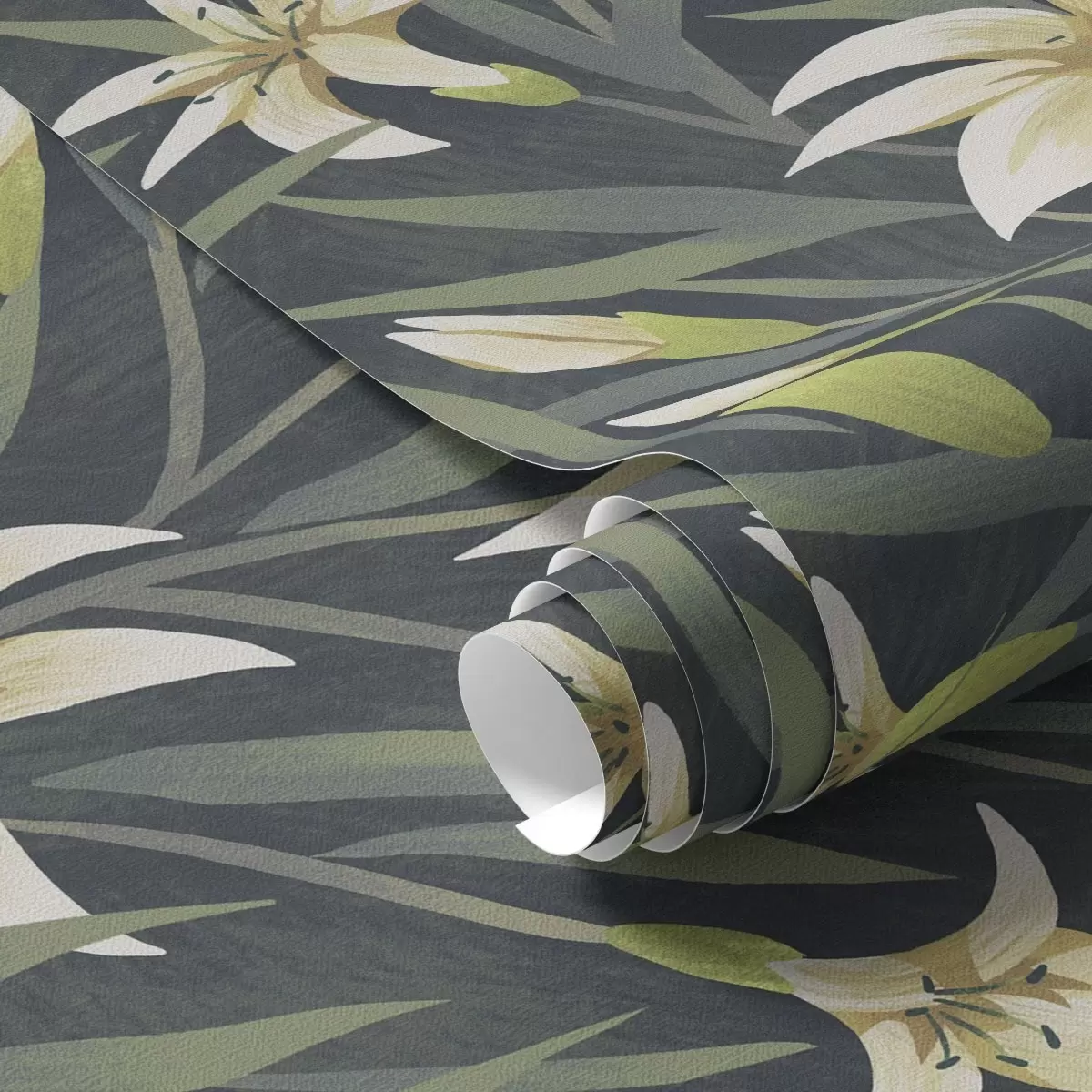 Tapete Cremefarbene Lilien mit Blättern auf dunklem Hintergrund Nr. a00837v1