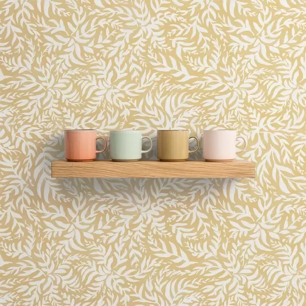 Tapete Weißes Blattmuster auf warmem Ocker, wirbelnder Rhythmus Nr. a00845
