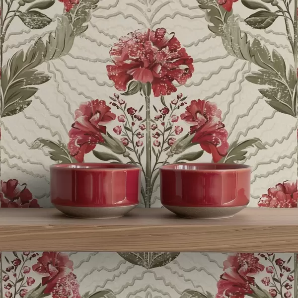 Tapete Große rote Pfingstrosen vor grafischem Hintergrund, cremefarbener Hintergrund Nr. a00857