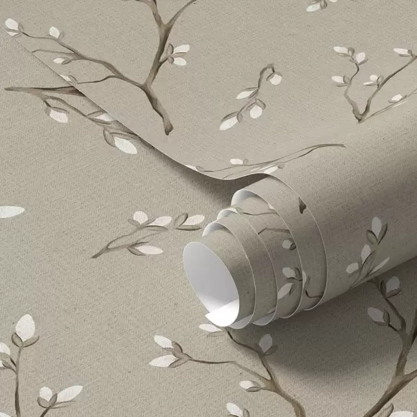 Tapete Zweige mit weißen Knospen auf taupefarbenem Leinenhintergrund Nr. a00861