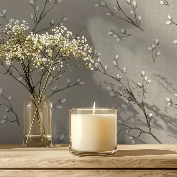 Tapete Zweige mit weißen Knospen auf taupefarbenem Leinenhintergrund Nr. a00861