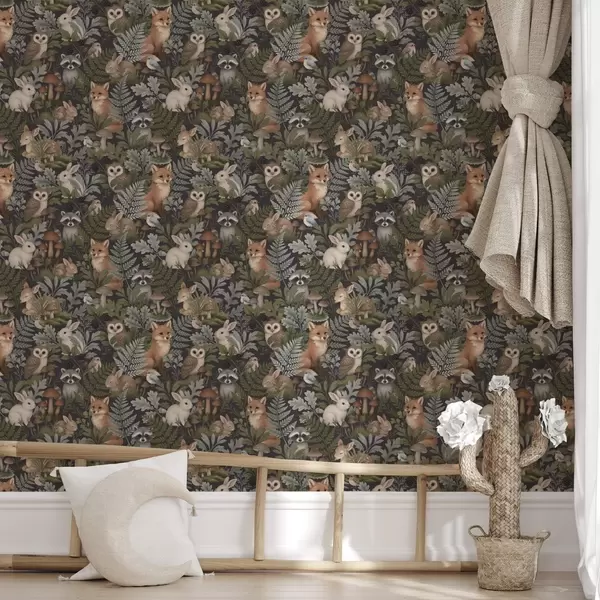 Tapete Waldtiere und Farne auf tiefem Anthrazit Nr. a00880