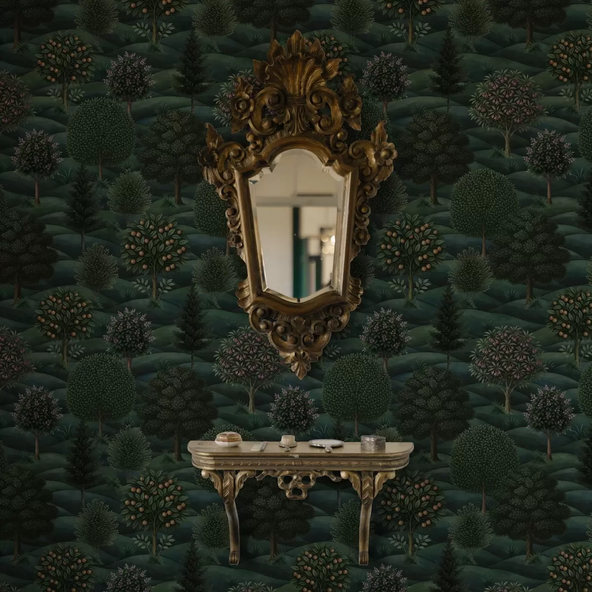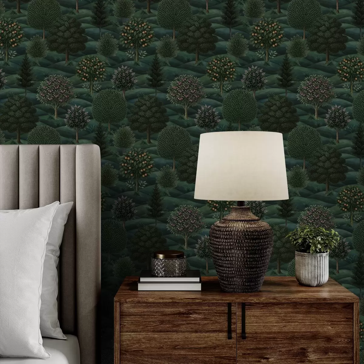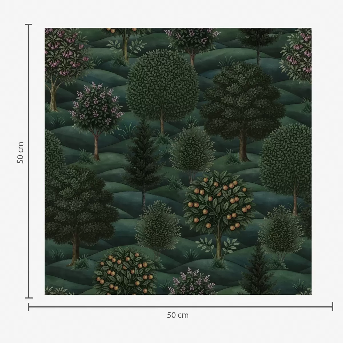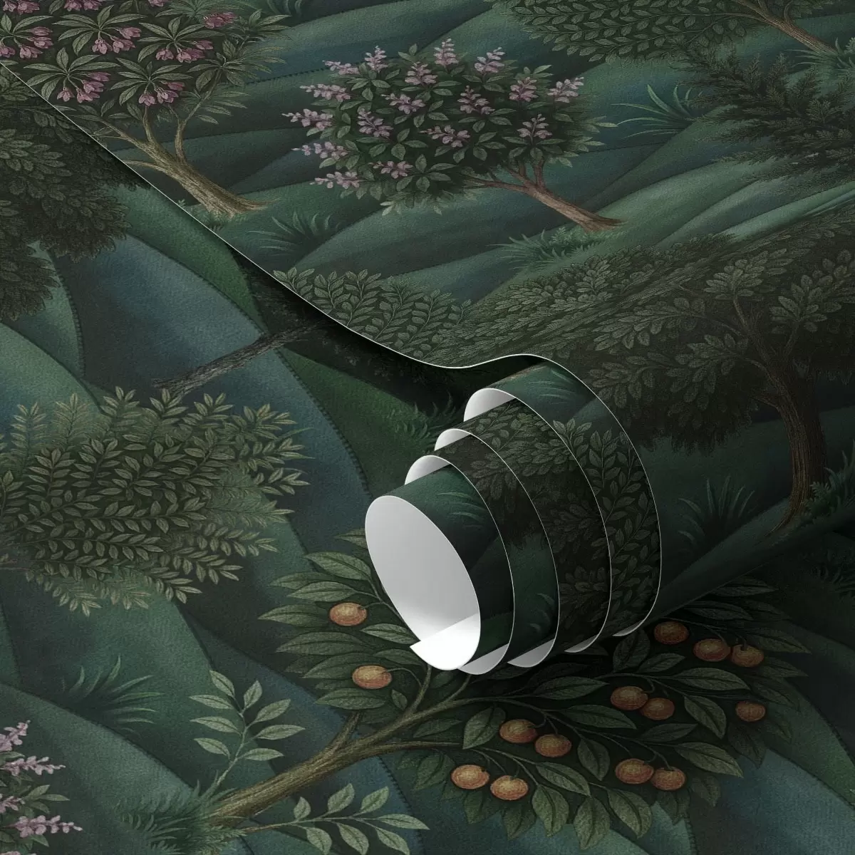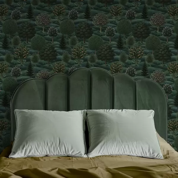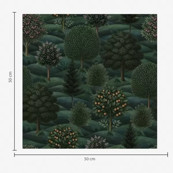 Tapete Üppig grüne Hügellandschaft mit gemusterten Bäumen Nr. a00892