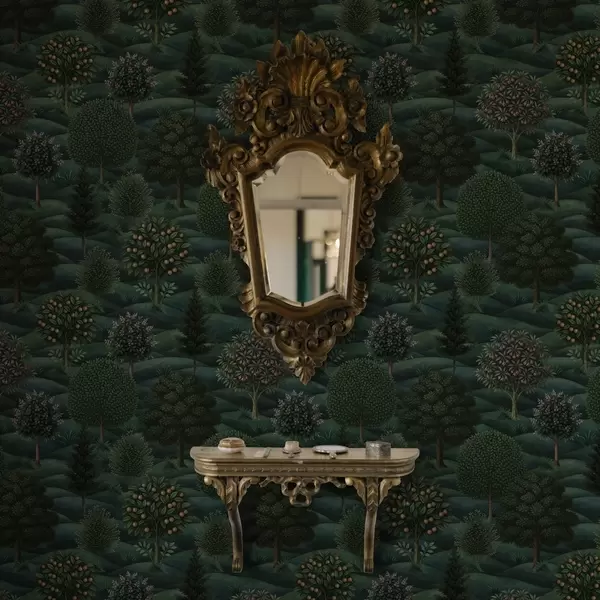 Tapete Üppig grüne Hügellandschaft mit gemusterten Bäumen Nr. a00892