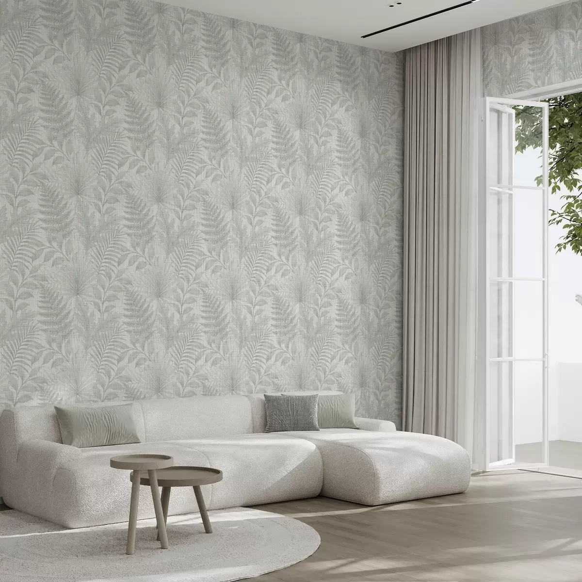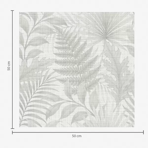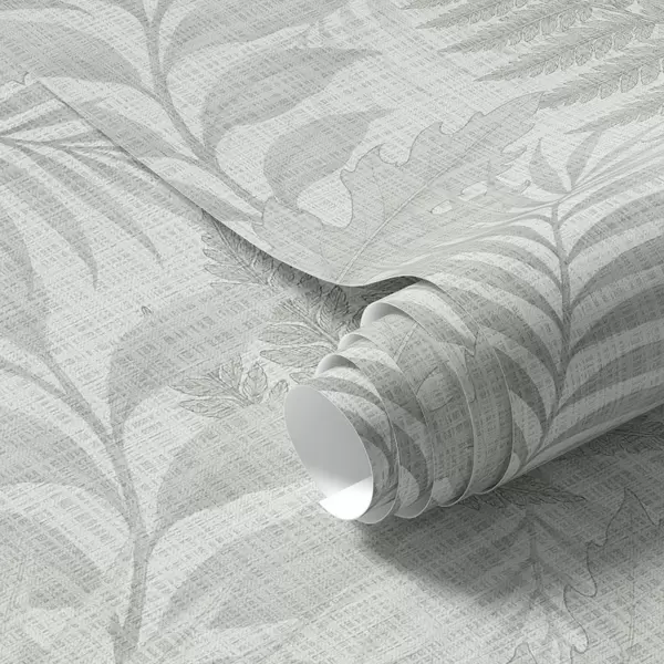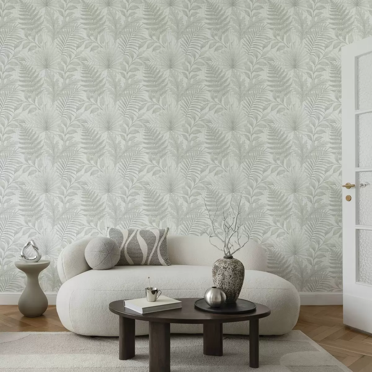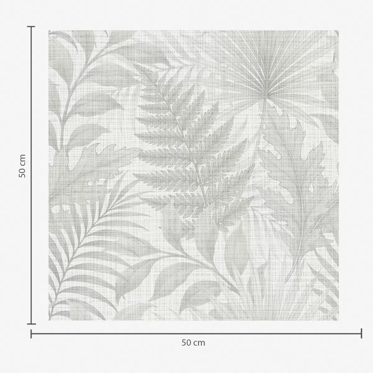 Tapete Weiche tropische Blätter in Hellgrau auf Leinenstruktur Nr. a00899