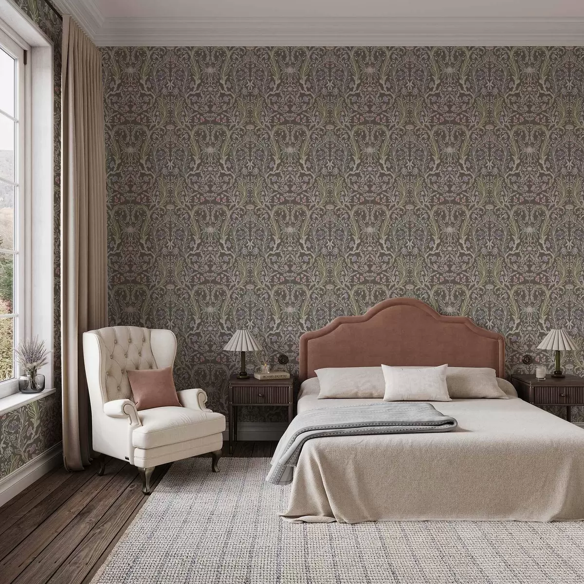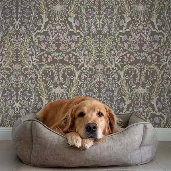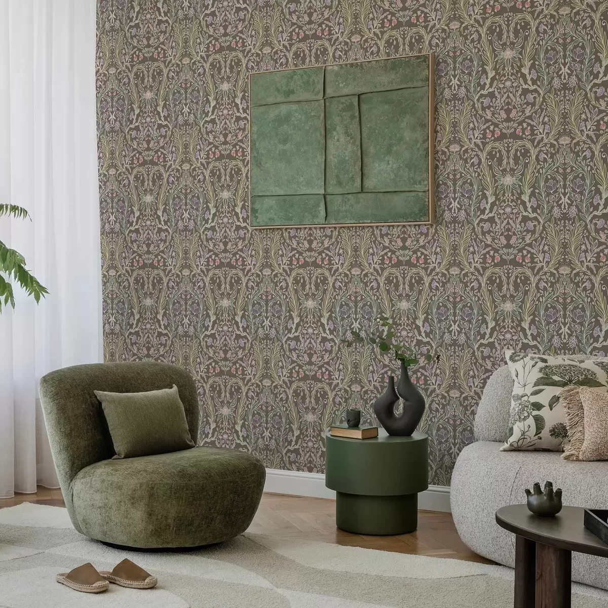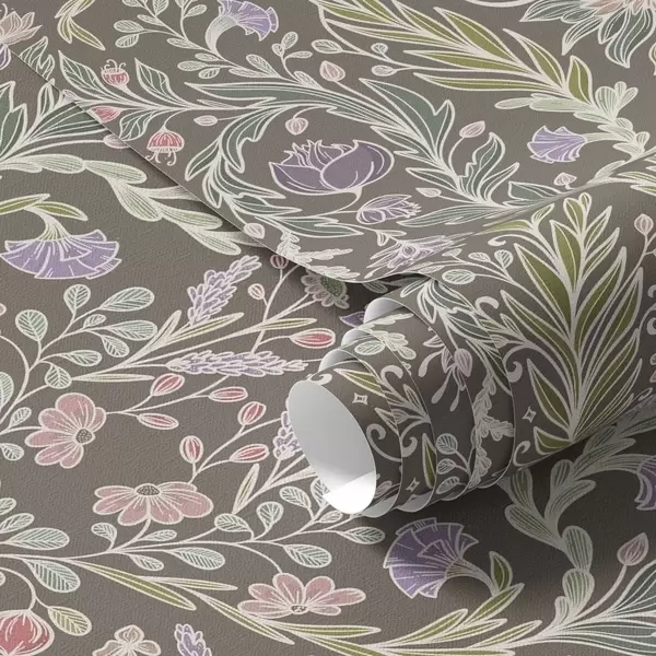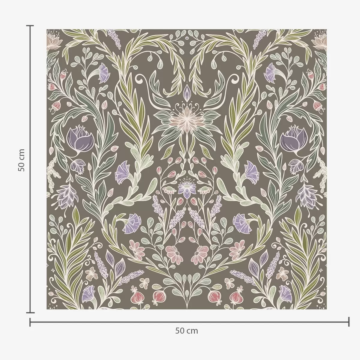 Tapete Symmetrische Blumen und Blätter auf bräunlich-grauem Hintergrund Nr. a00928v2