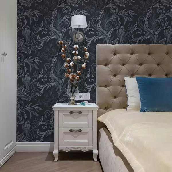Tapete Dunkelindigo-farbene, gewellte Blätter mit handgezeichneten Schattierungen Nr. a00935