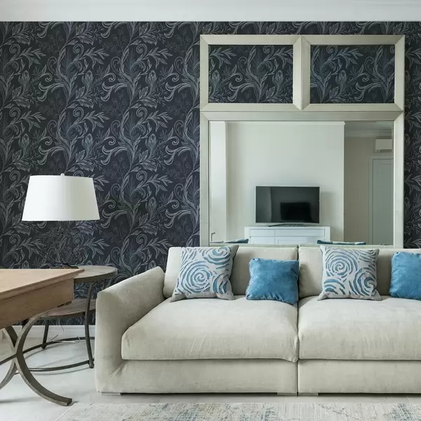 Tapete Dunkelindigo-farbene, gewellte Blätter mit handgezeichneten Schattierungen Nr. a00935