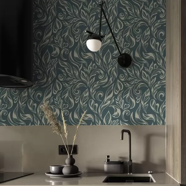 Tapete Blattmuster aus hellen Linien auf blaugrauem Hintergrund Nr. a00940