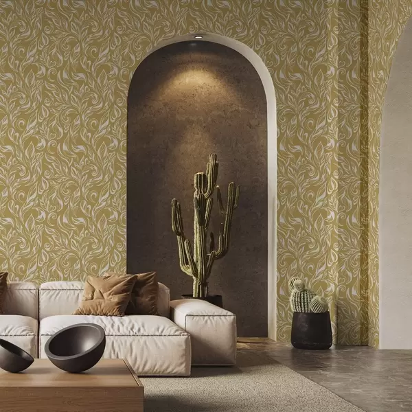 Tapete Cremeweißes Blattornament auf warmem Ockerhintergrund Nr. a00940v1