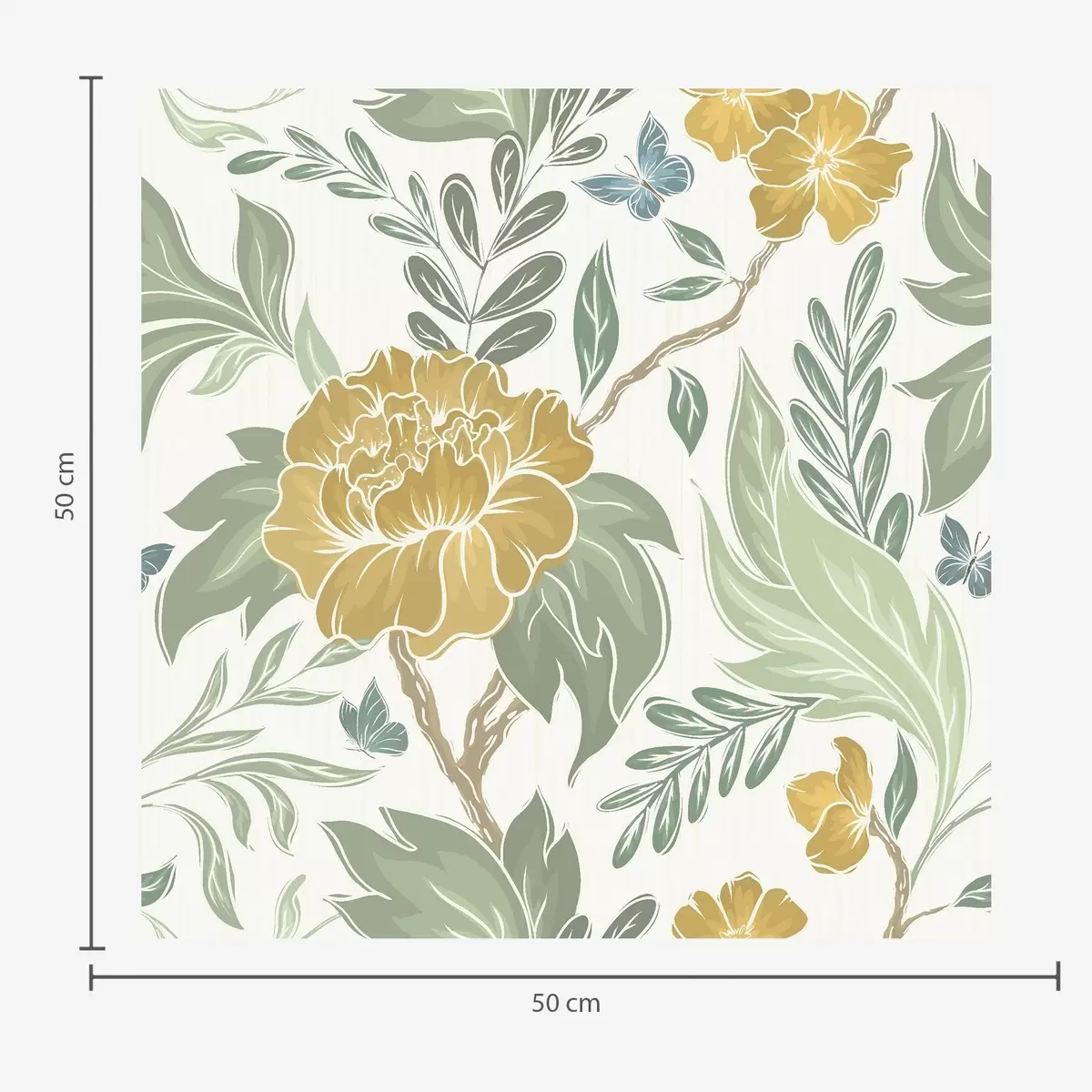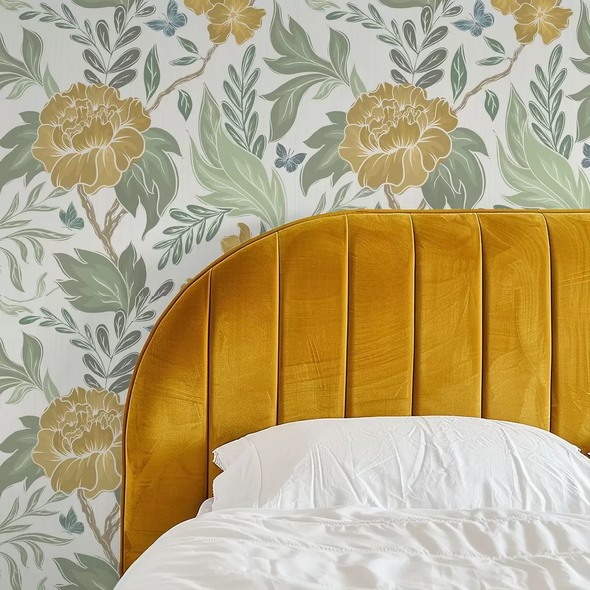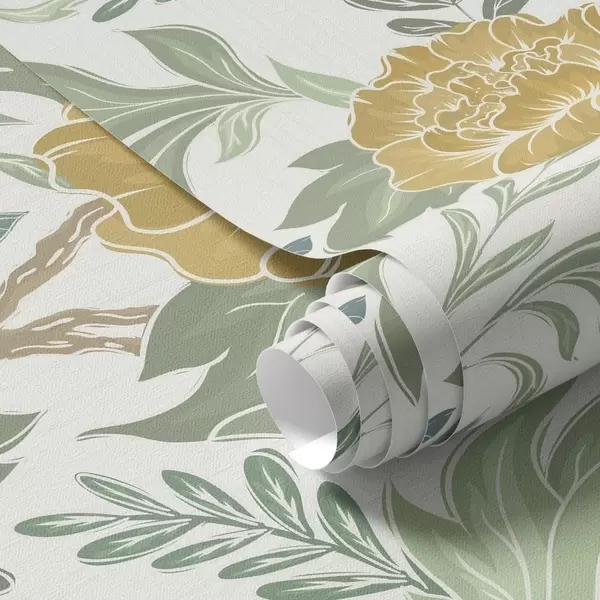 Tapete Große gelbe Pfingstrosen und Grünpflanzen auf hellem Hintergrund Nr. a00941