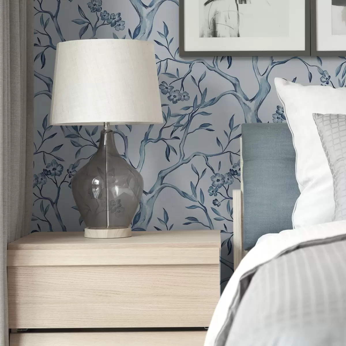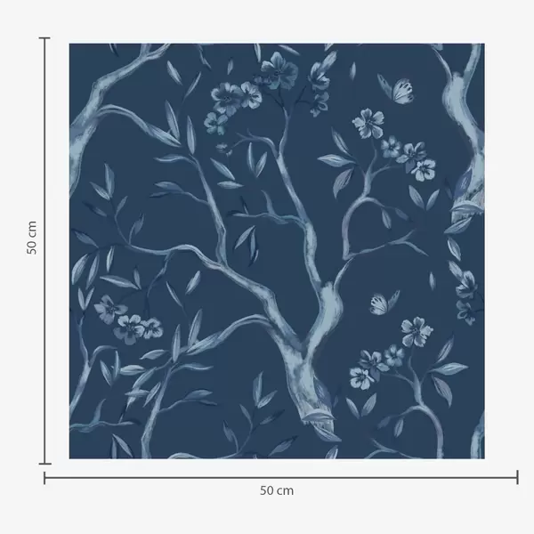Tapete Aquarellblaue Zweige mit Blumen und Schmetterlingen auf hellem Hintergrund Nr. a00951