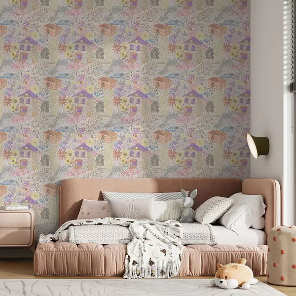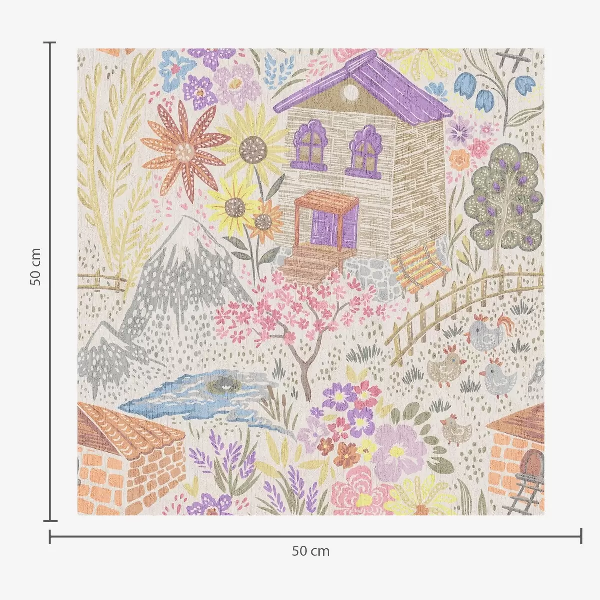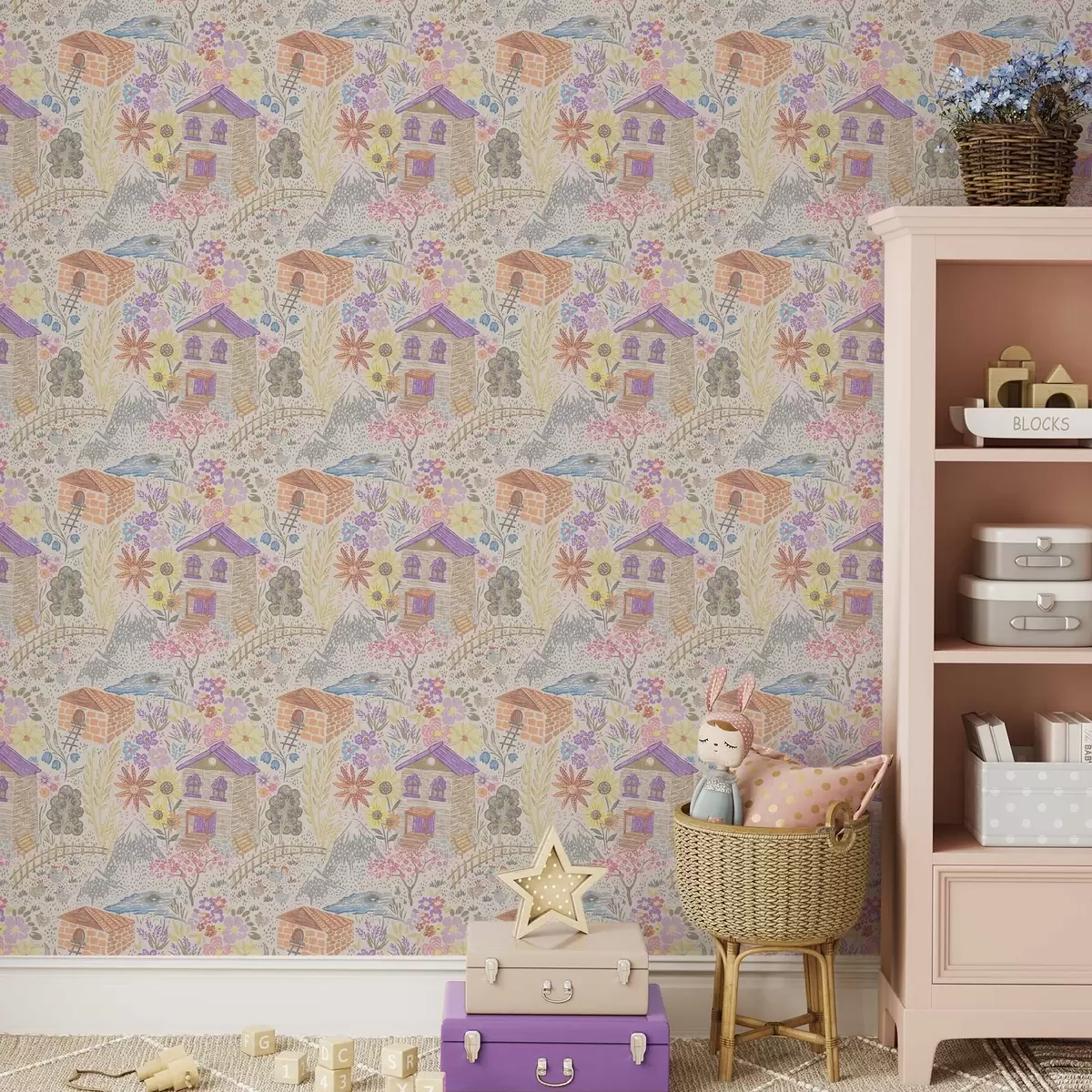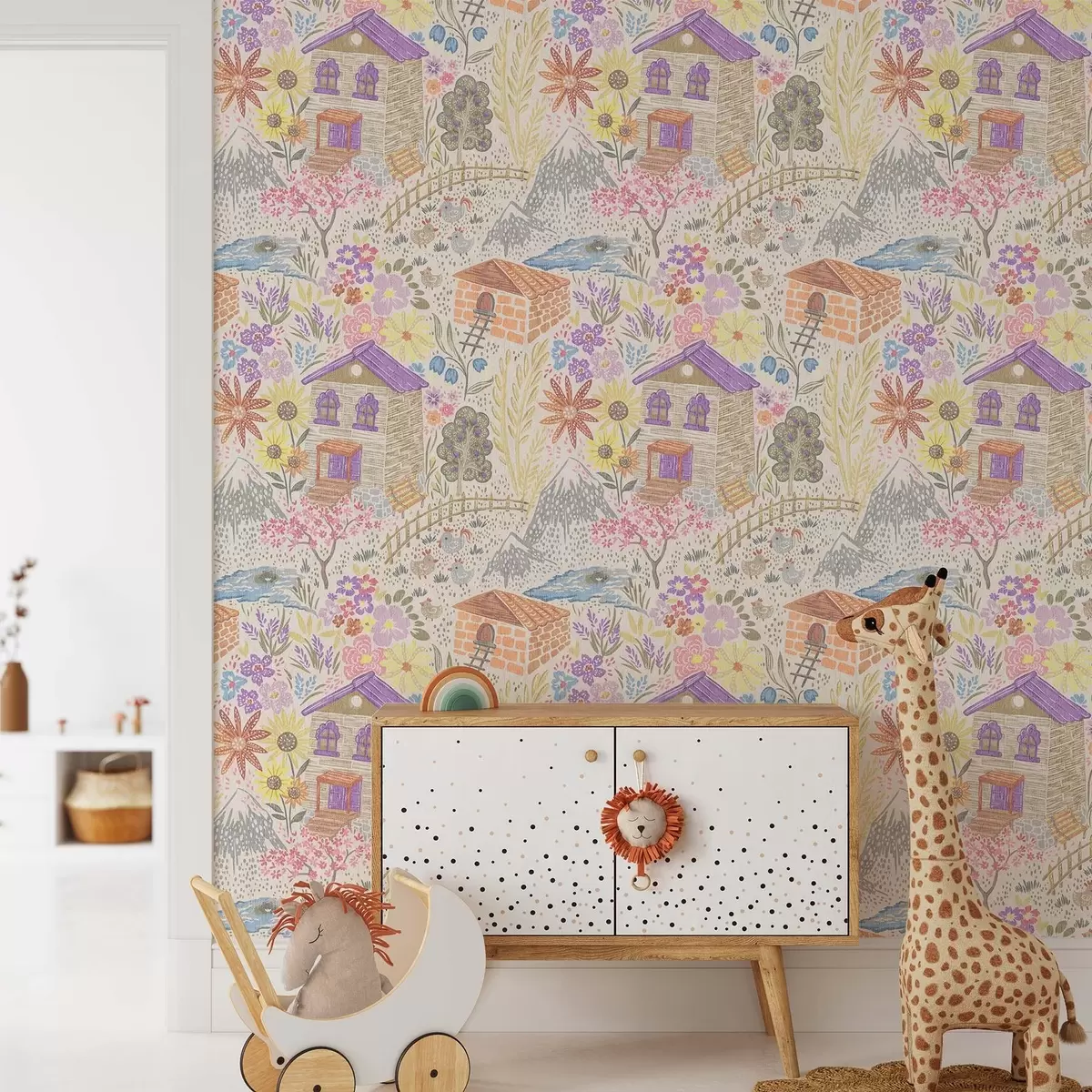 Tapete Kindliche Dorfzeichnung mit einem Haus, Bergen und Blumen Nr. a00952