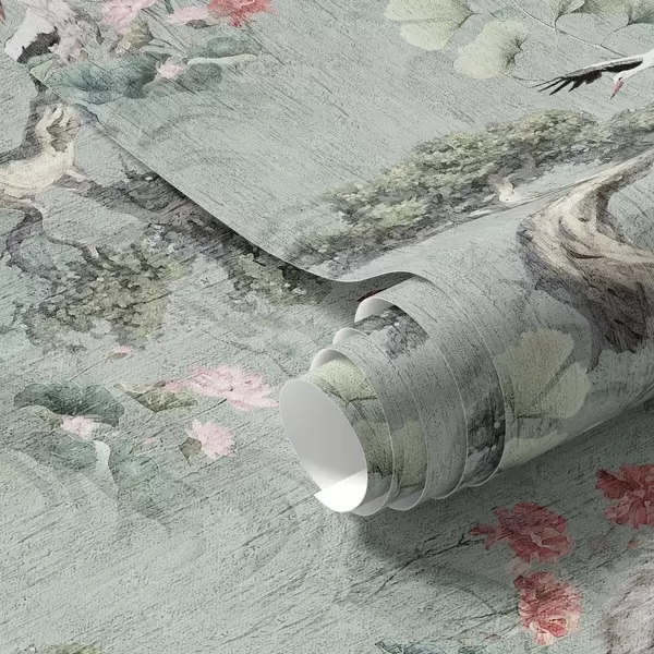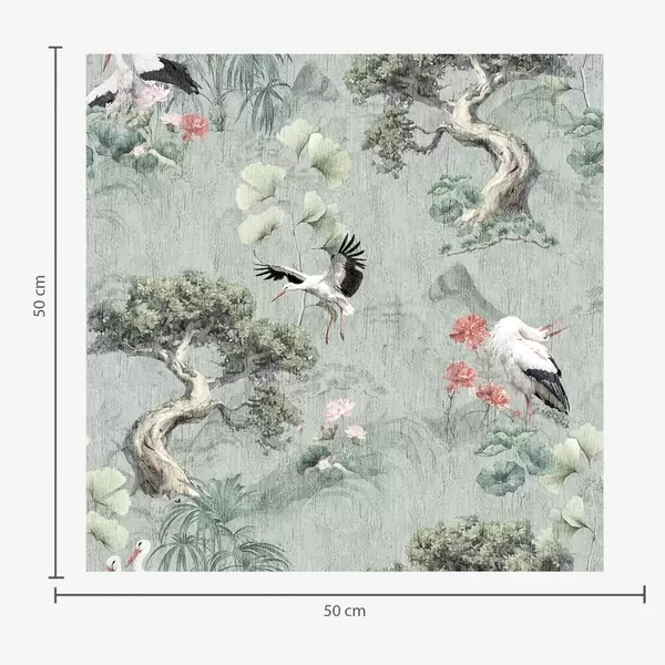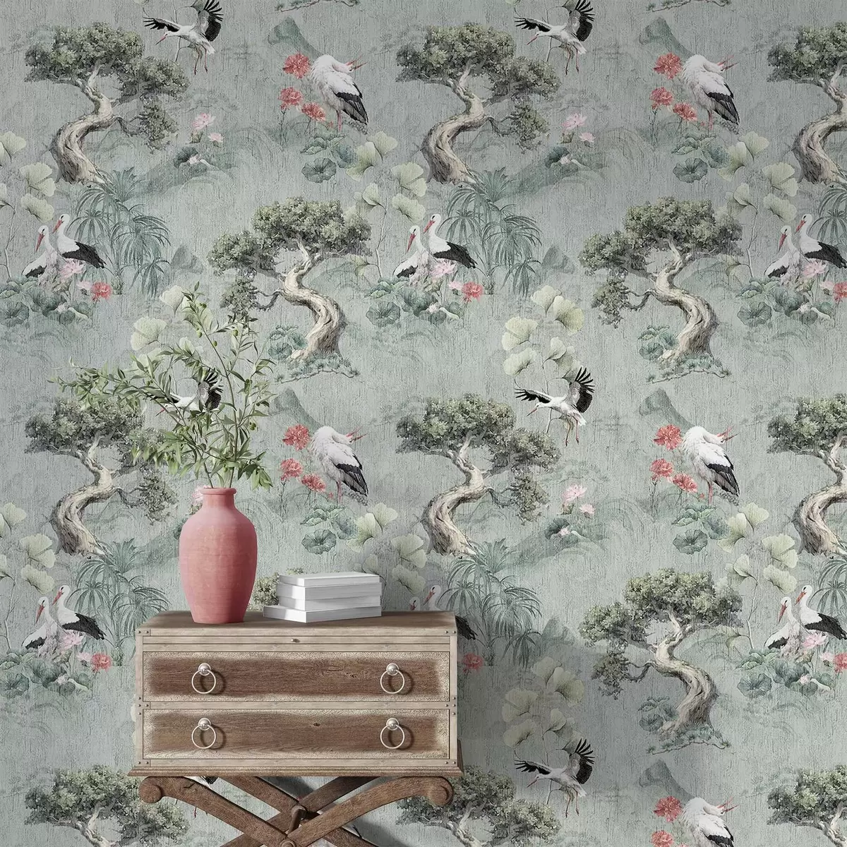 Tapete Kraniche zwischen Kiefern und Lotusblumen vor einem ruhigen grünen Hintergrund Nr. a00962