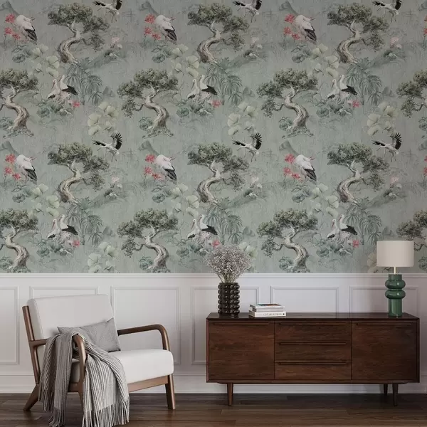 Tapete Kraniche zwischen Kiefern und Lotusblumen vor einem ruhigen grünen Hintergrund Nr. a00962