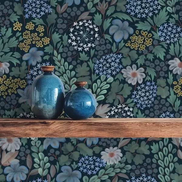 Tapete Nachtgarten mit blauen Lilien, Beeren und wildem Grün Nr. a00996
