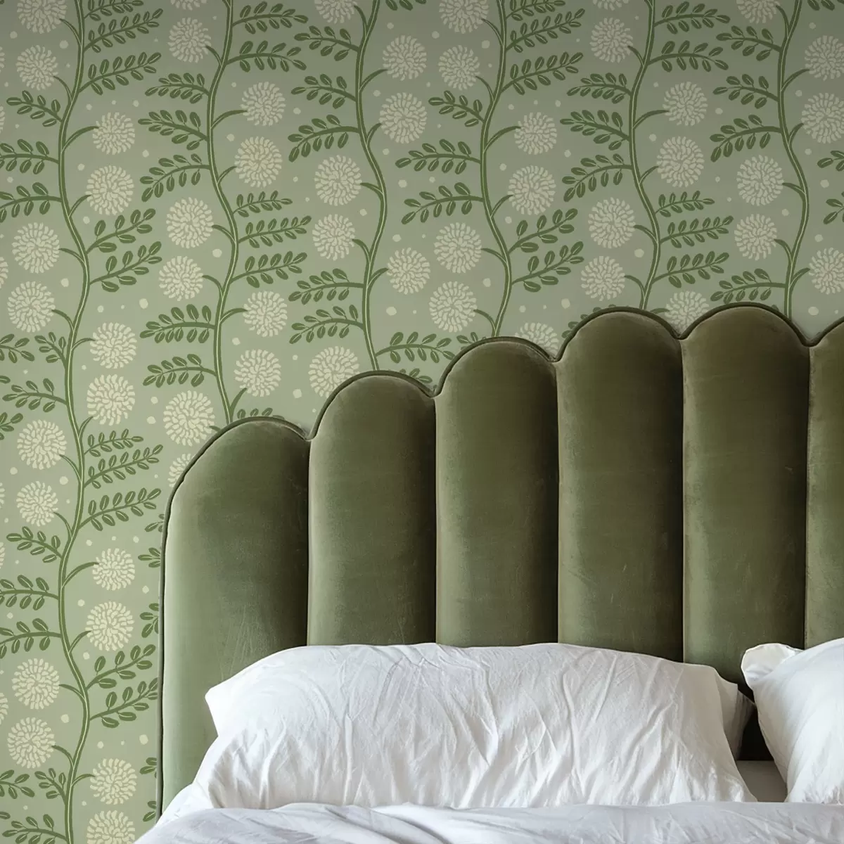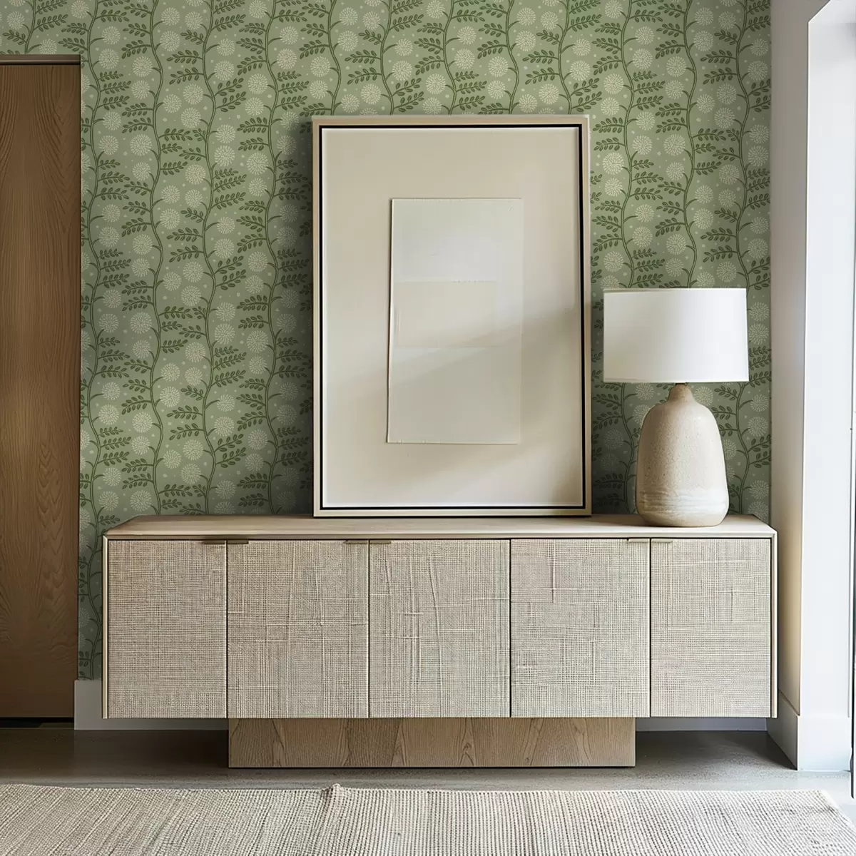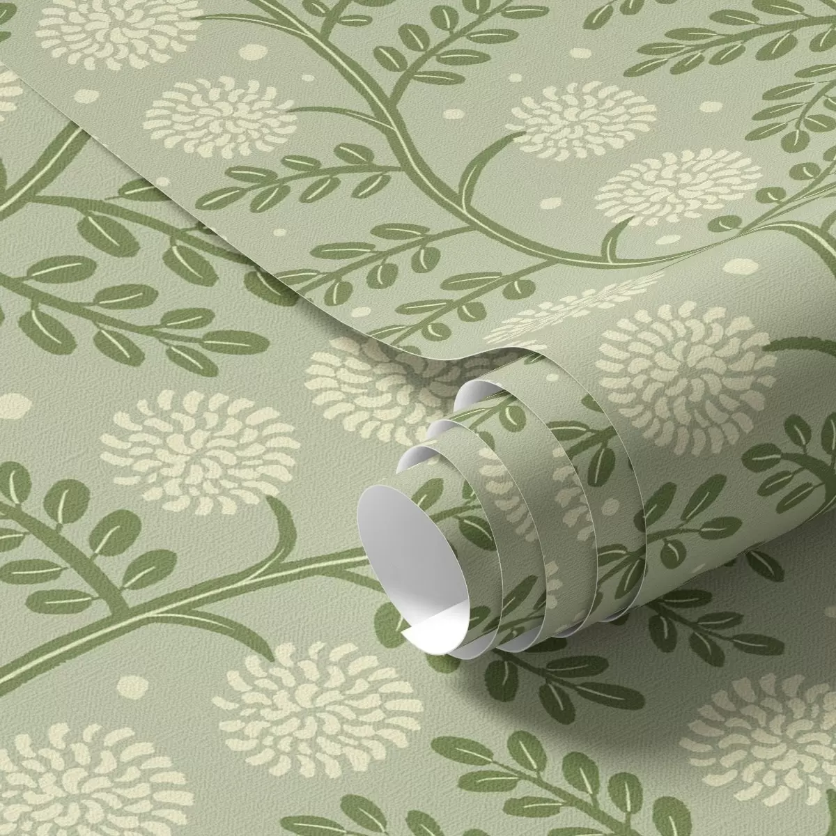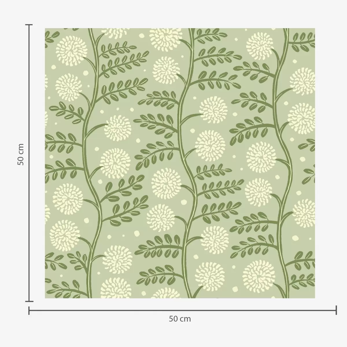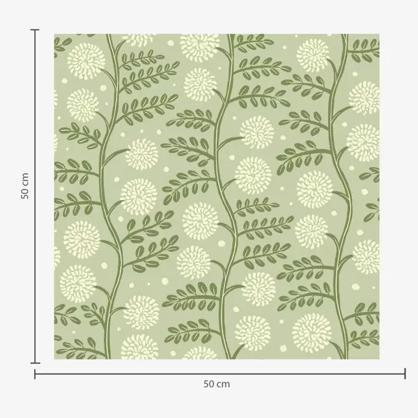 Tapete Salbeigrüne Stiele mit elfenbeinfarbenen, flauschigen Blüten und Punkten Nr. a00997v2