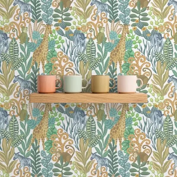 Tapete Fröhliche Savannentiere zwischen Blättern auf weißem Hintergrund Nr. a01000