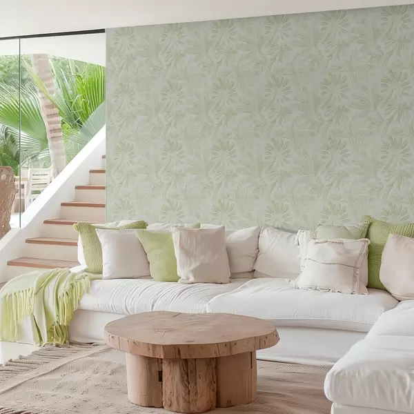 Tapete Skizzierte tropische Blätter in frischen Hellgrüntönen Nr. a01001v1