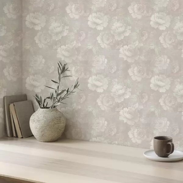 Tapete Verblasste Pfingstrosen auf Leinenstruktur in sanften Beigetönen Nr. a01018