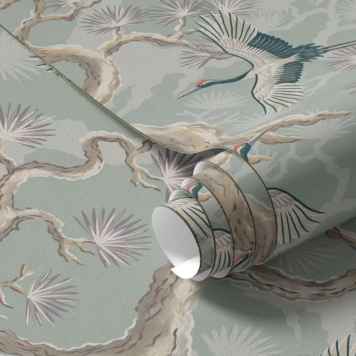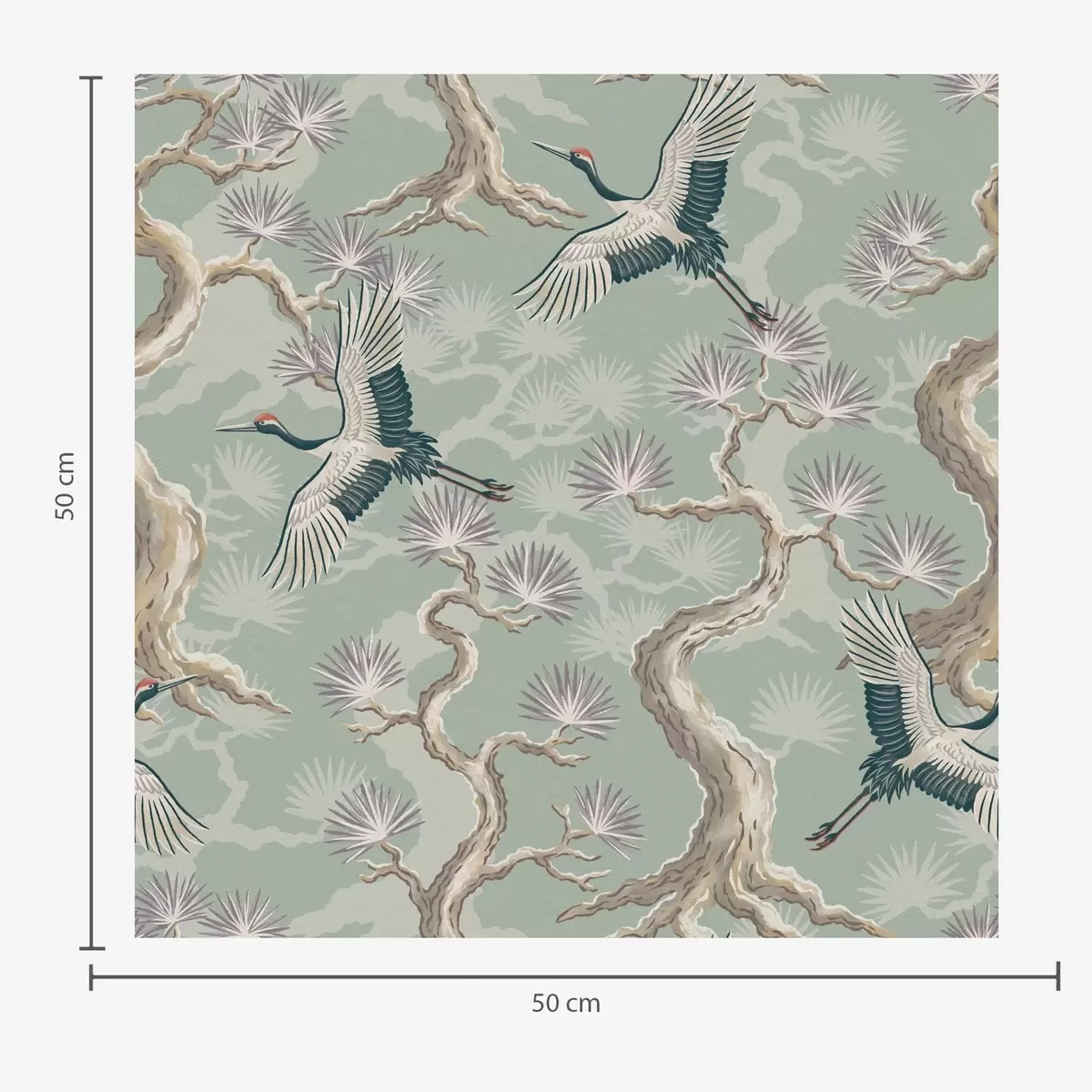 Tapete Kraniche zwischen geschwungenen Ästen auf einem sanften, salbeifarbenen Hintergrund Nr. a01023