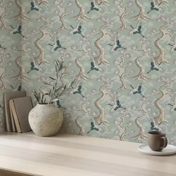 Tapete Kraniche zwischen geschwungenen Ästen auf einem sanften, salbeifarbenen Hintergrund Nr. a01023