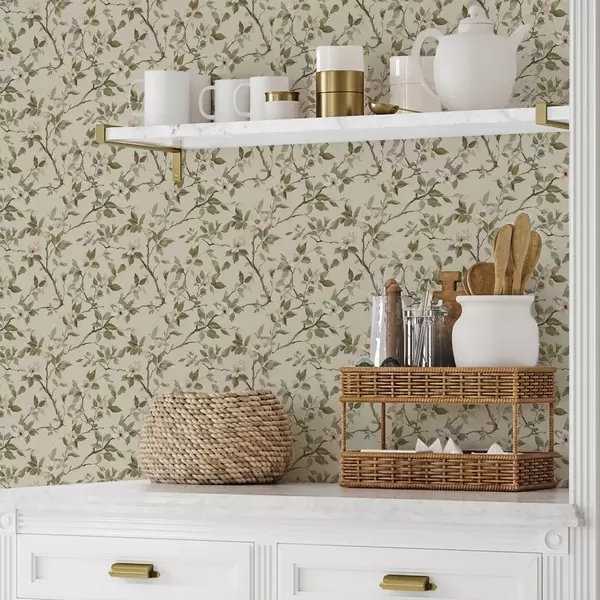 Tapete Leichte Zweige mit winzigen cremefarbenen Blüten und grünen Blättern Nr. a01028
