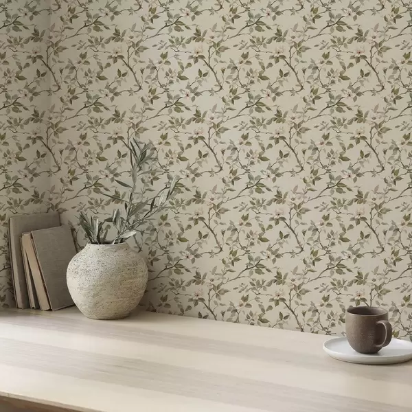 Tapete Leichte Zweige mit winzigen cremefarbenen Blüten und grünen Blättern Nr. a01028
